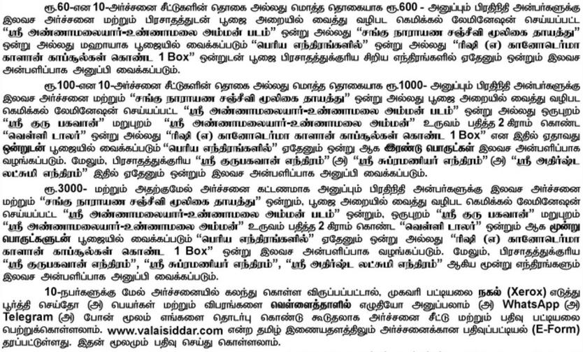 கீழ்காணும் படிவத்தில் அர்ச்சனைக்கு ஒரு நபர் முதல் பத்து நபர்கள் வரை பதிவு செய்து கொள்ளலாம். பத்து நபர்களை பதிவு செய்யும் பிரதிநிதி (11-வது) அன்பருக்கு அர்ச்சனை, எந்திரம் இலவச அன்பளிப்பாக வழங்கப்படும்.