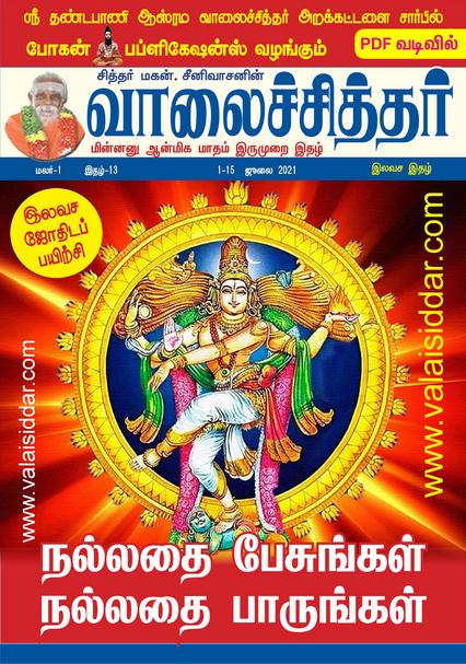 அன்பிற்கினிய ஆன்மிக அன்பர்களே, வணக்கம். திருவண்ணாமலை, ஸ்ரீ தண்டபாணி ஆஸ்ரமத்தின் சார்பில், அருள்மிகு அண்ணாமலையார் அருளால் பல்வேறு ஆன்மிக விளக்கங்கள், செய்திகளுடன் PDF வடிவில் மாதம் இருமுறை " வாலைச்சித்தர் " மின்னணு இலவச ஆன்மிக இதழ் பதிப்பிட்டு வருகிறது... இப்பதிப்பினை அனைவருக்கும் இலவசமாக " வாட்ஸ்ஆப் " மூலம் அனுப்பபட்டுவருகிறது...
